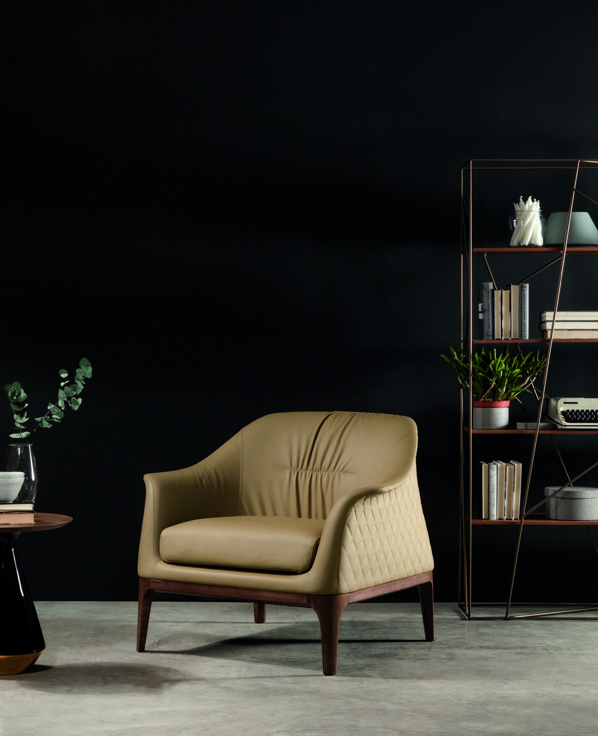 Fotoliul TIFFANY de la Tonin Casa este inspirat de luxul delicat: structura din lemn se imbina subtil cu tapiseia din piele produsa de cei mai buni manufacturieri italieni.