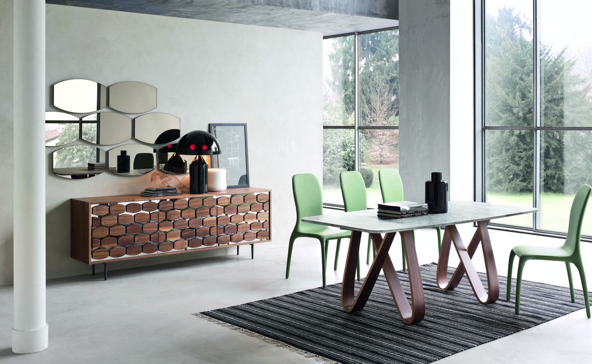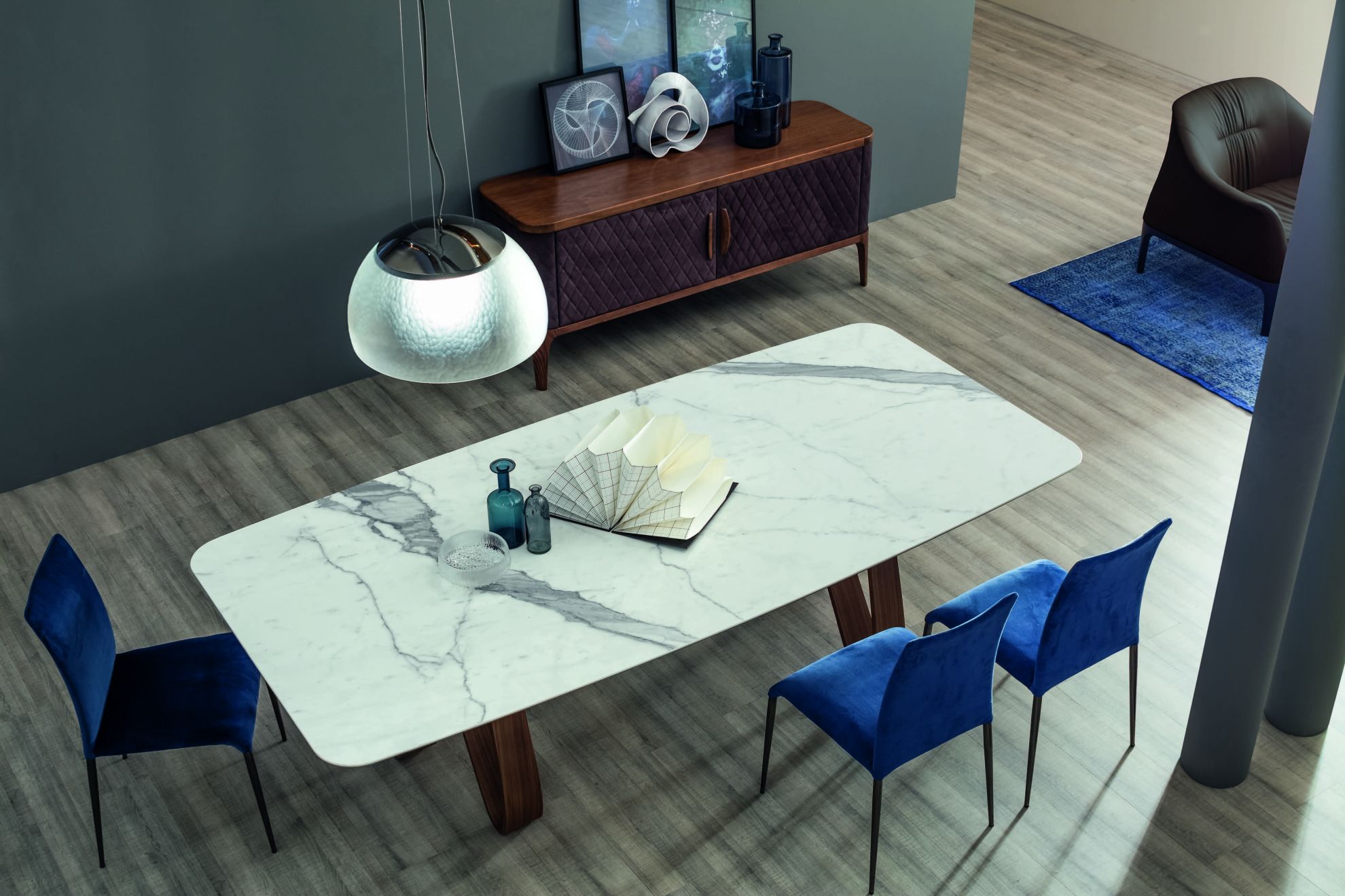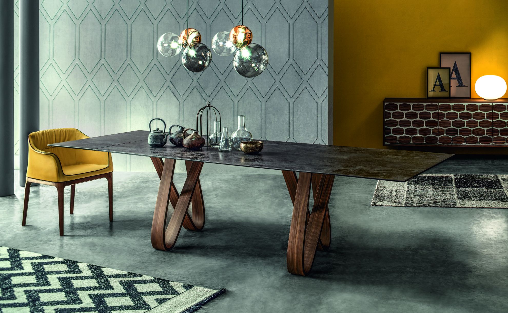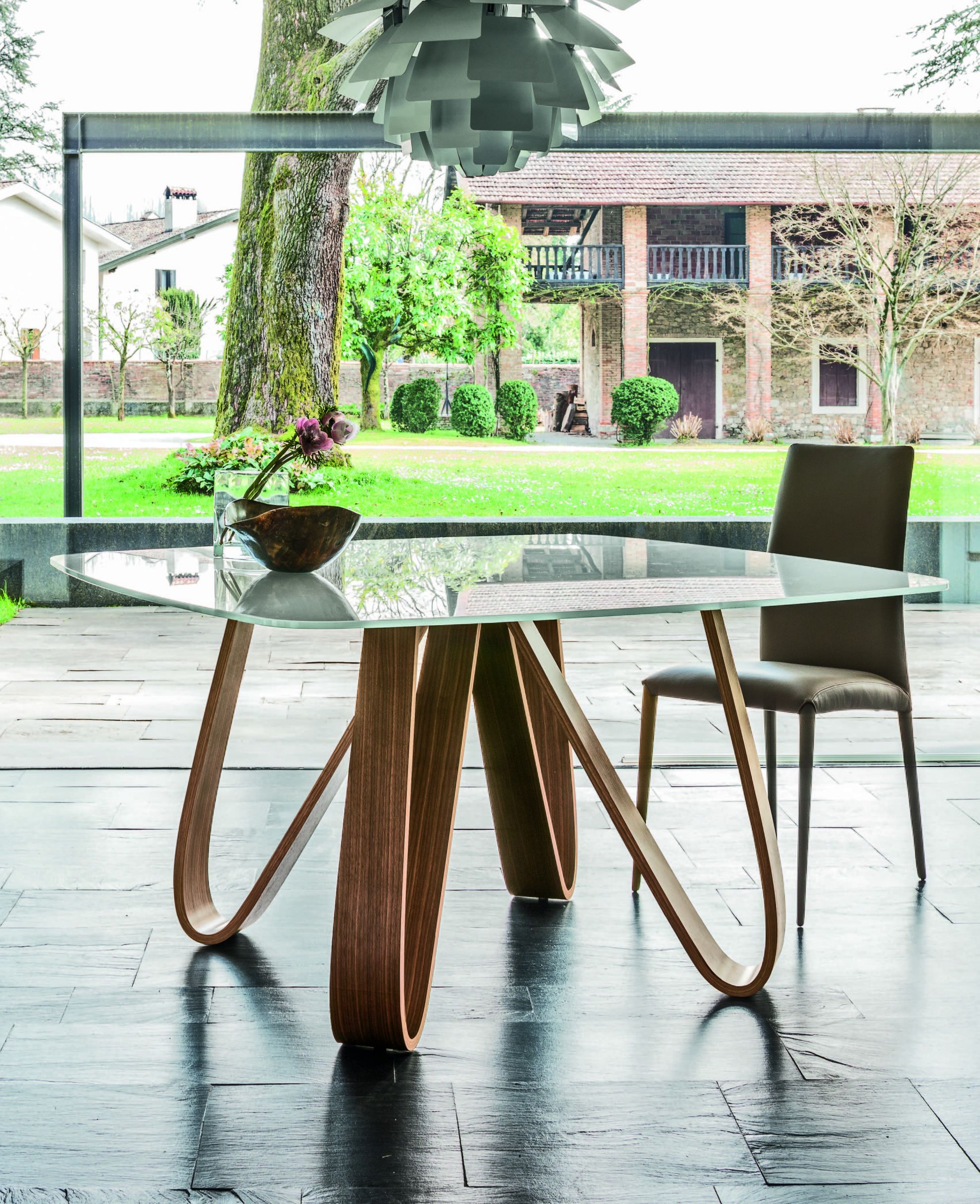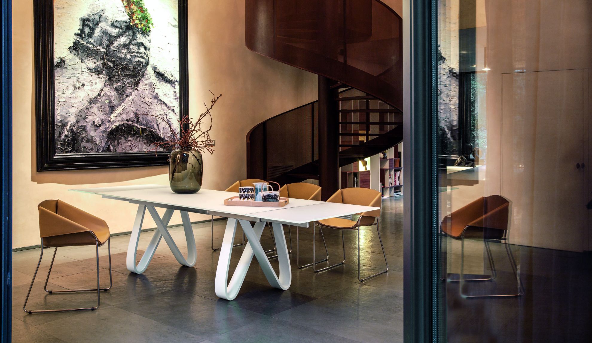 Masa BUTTERFLY de la Tonin Casa este o masa cu un design modern, disponibila in varianta fixa sau extensibila, cu mecanism din aluminiu si blat din sticla, marmura, ceramica sau lemn.