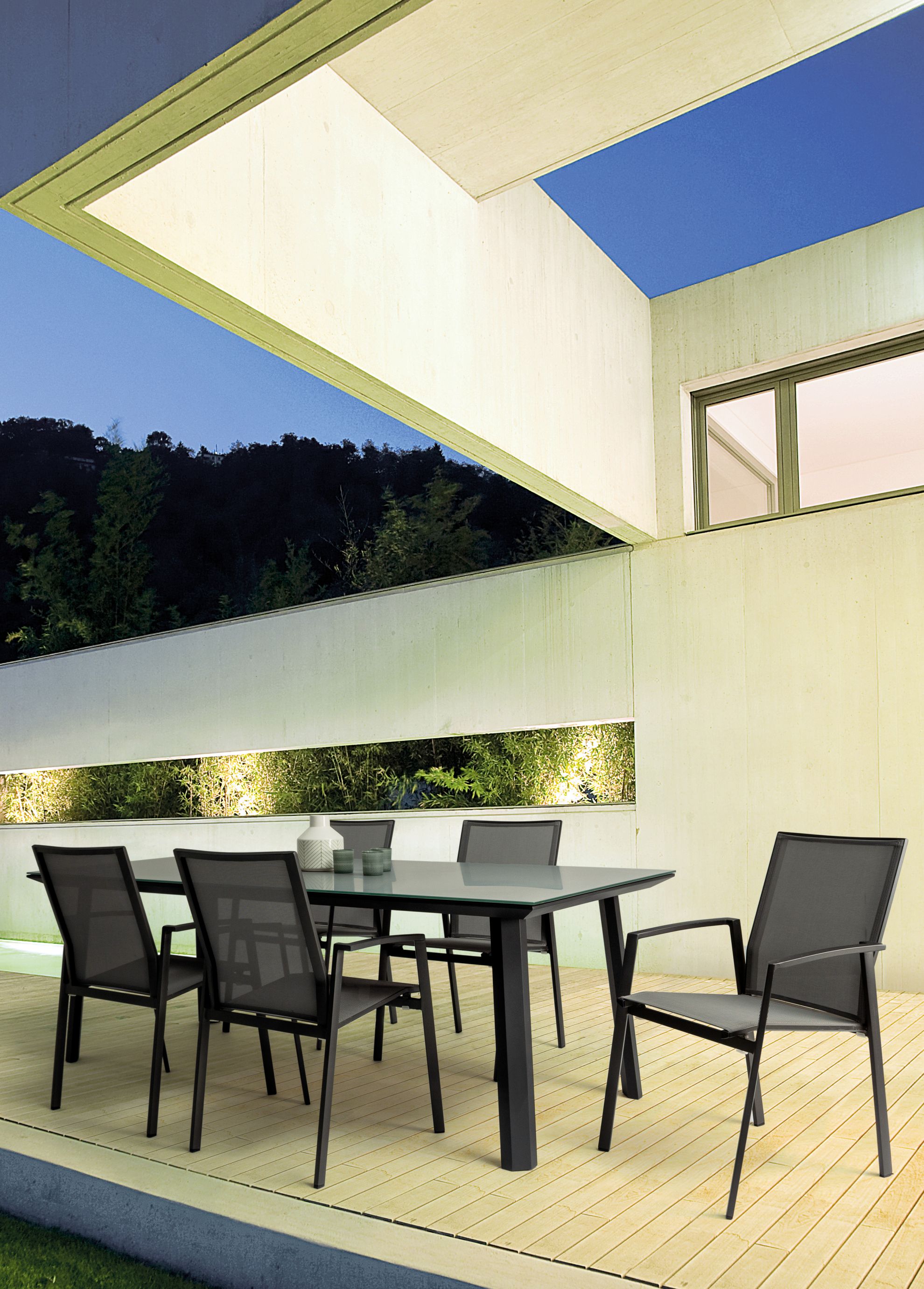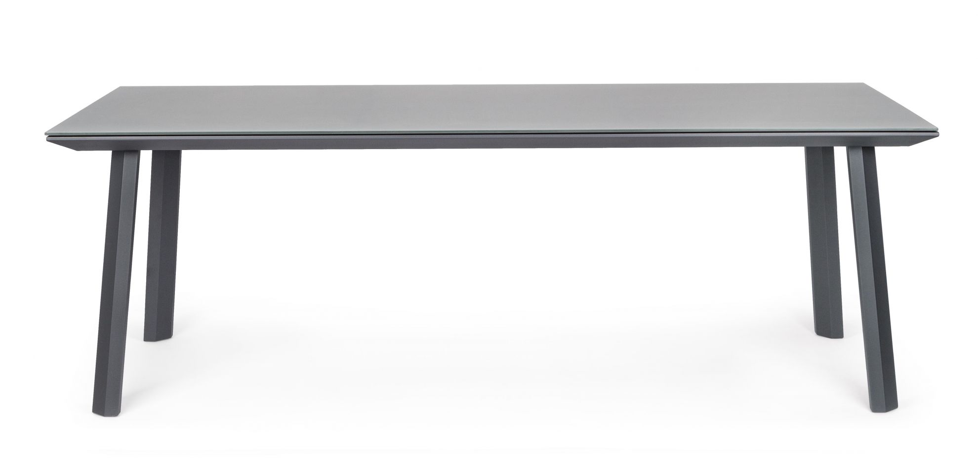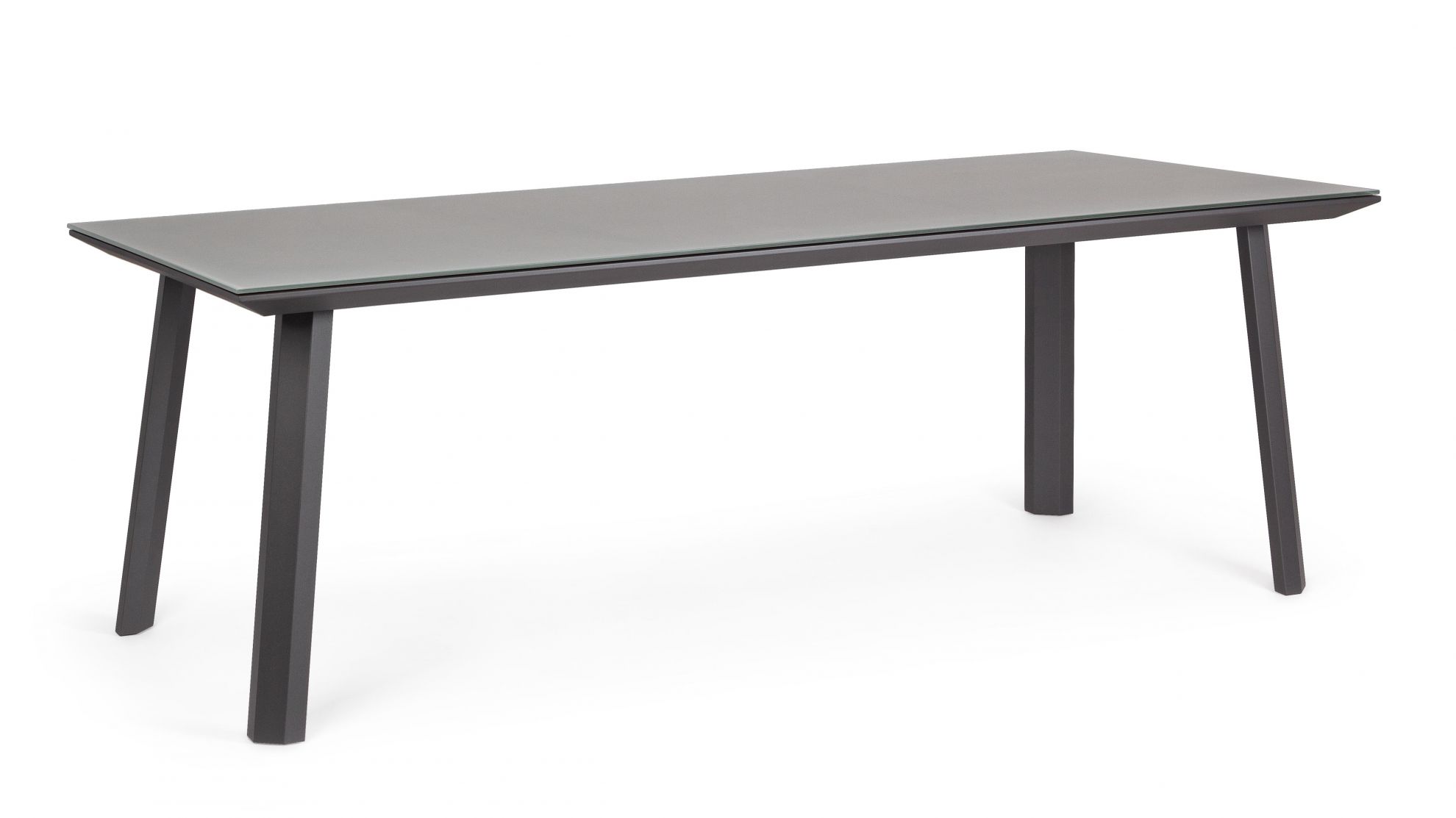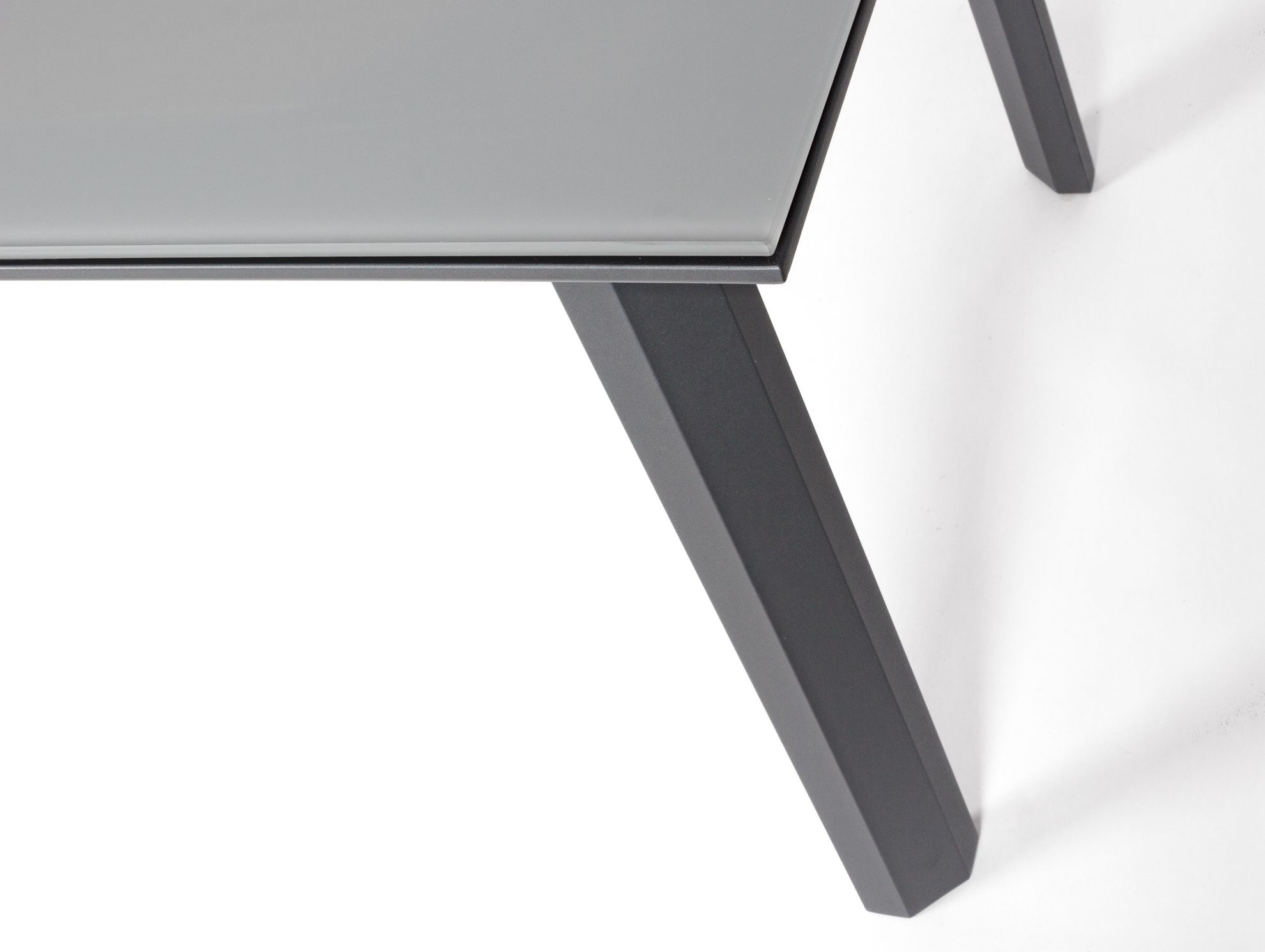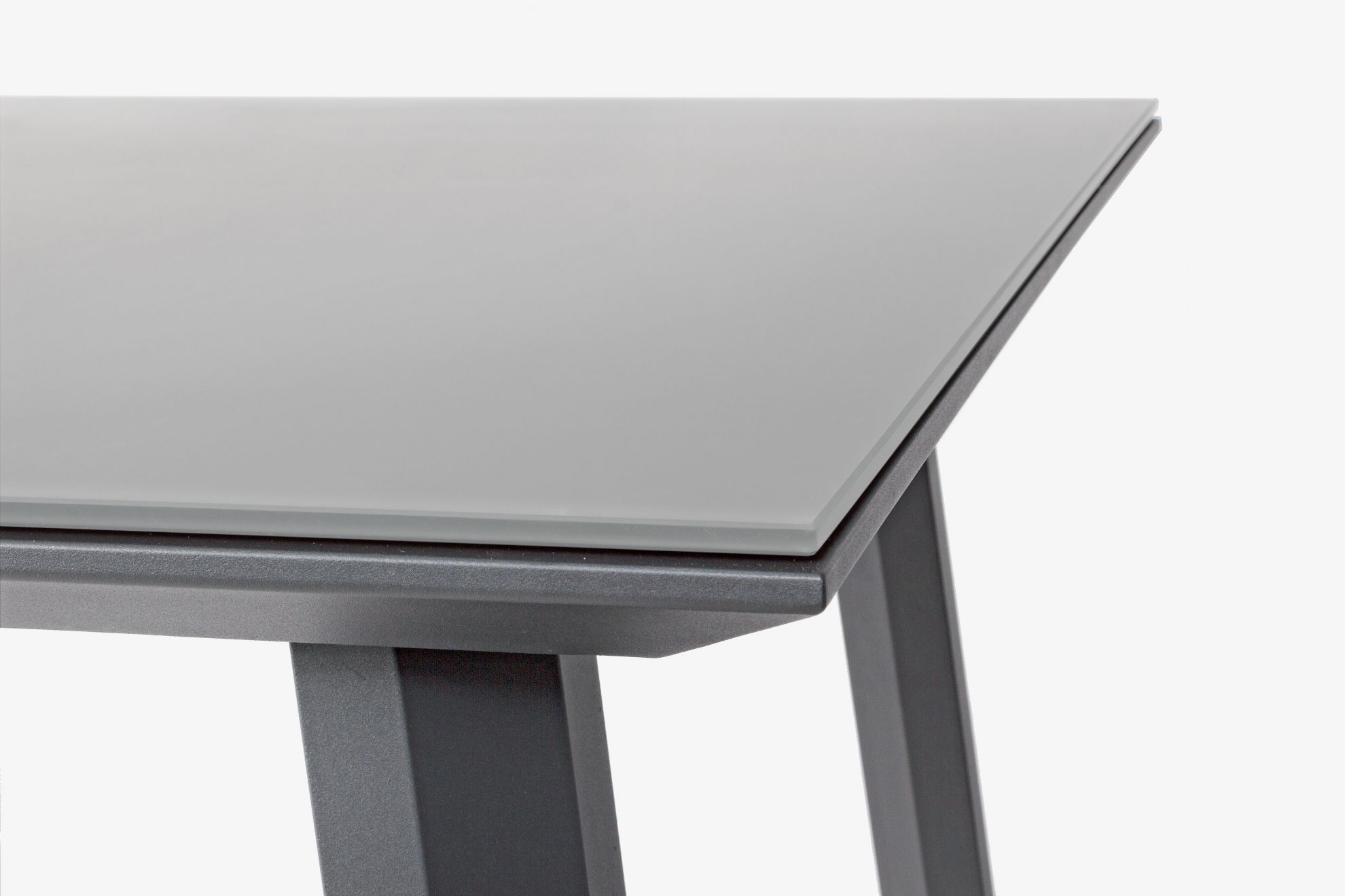 Gavin este o masa pentru exterior cu structura din aluminiu si blat din sticla.