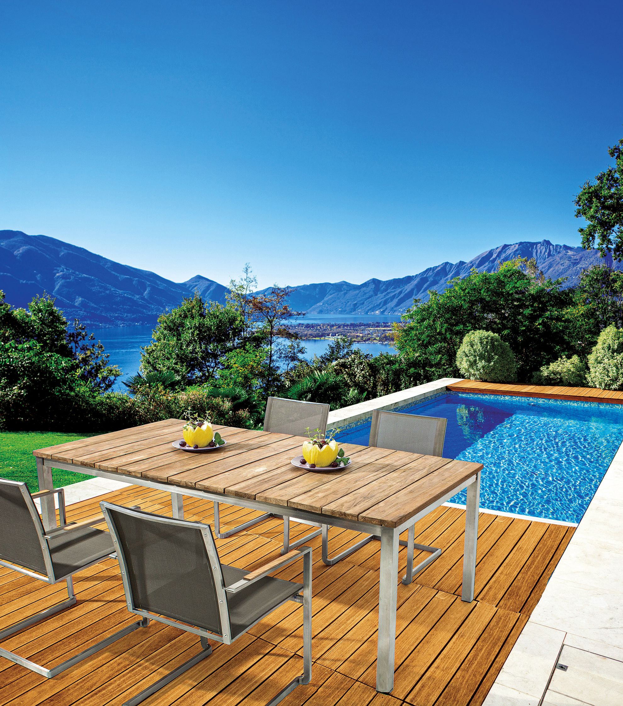 Murphy este o masa pentru exterior cu picioare din otel si blat din lemn de tec.