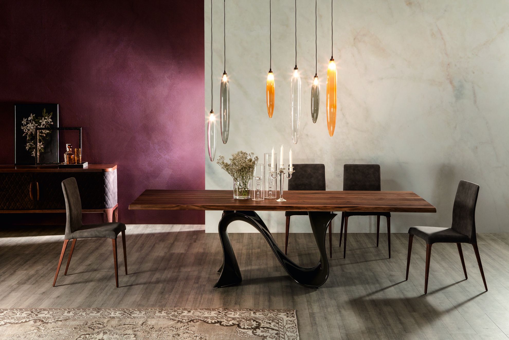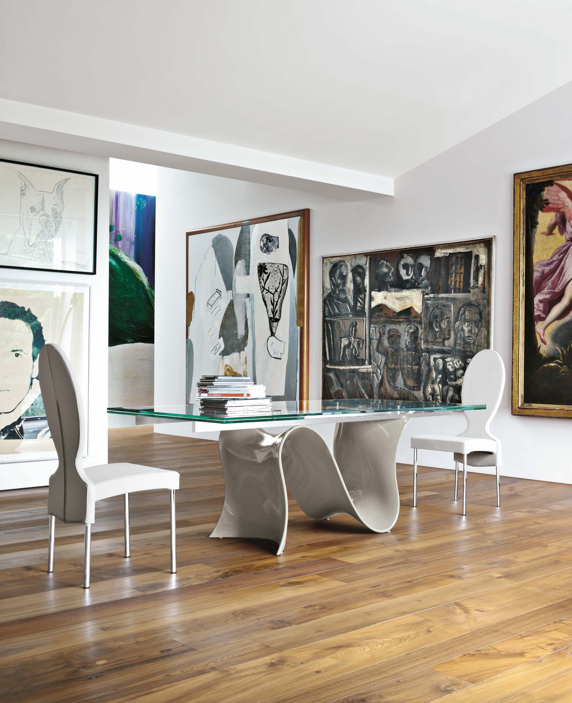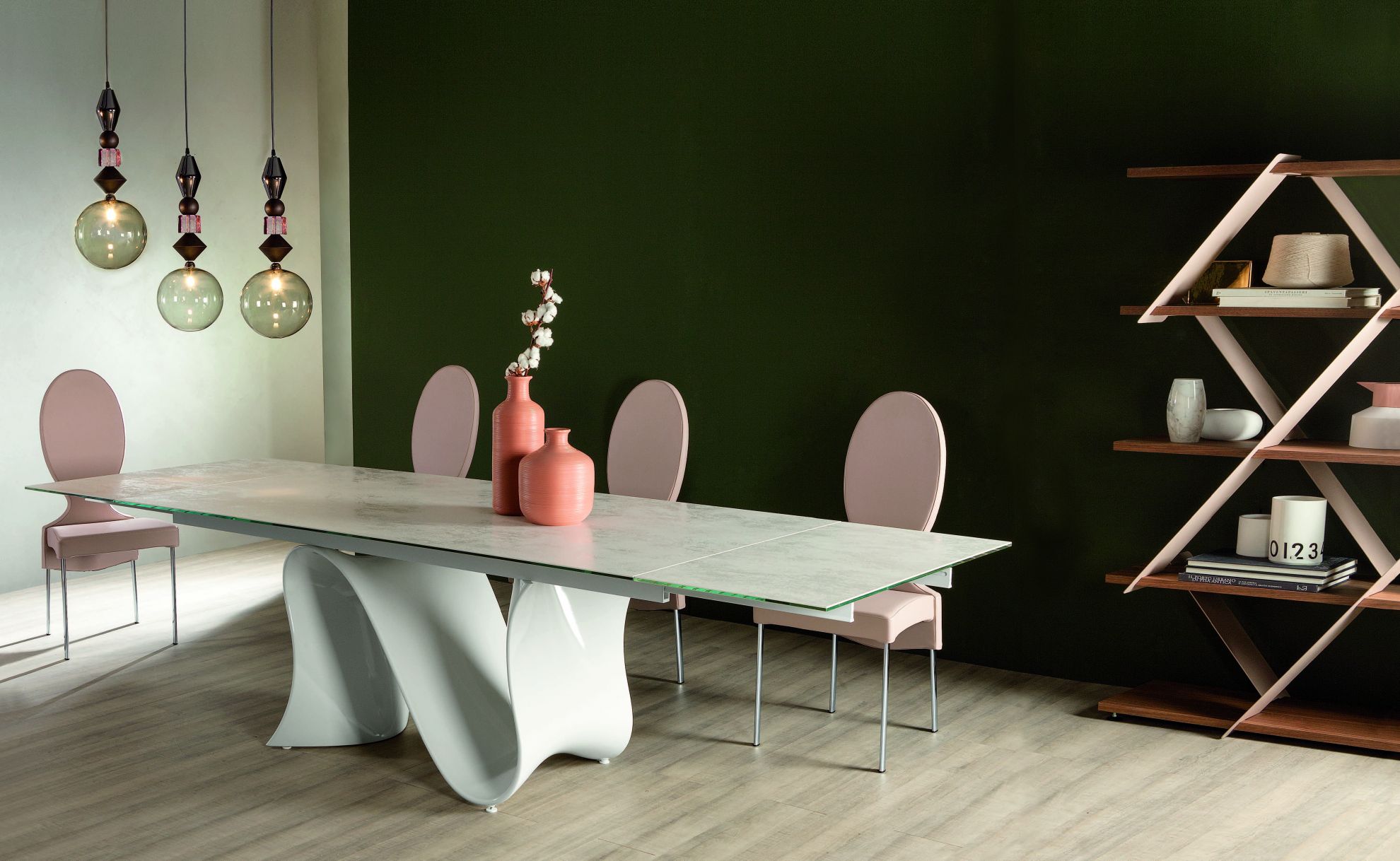 Masa WAVE de la Tonin Casa este o masa cu un design modern, disponibila in varianta fixa sau extensibila, cu mecanism din aluminiu si blat din sticla, marmura, ceramica sau lemn.