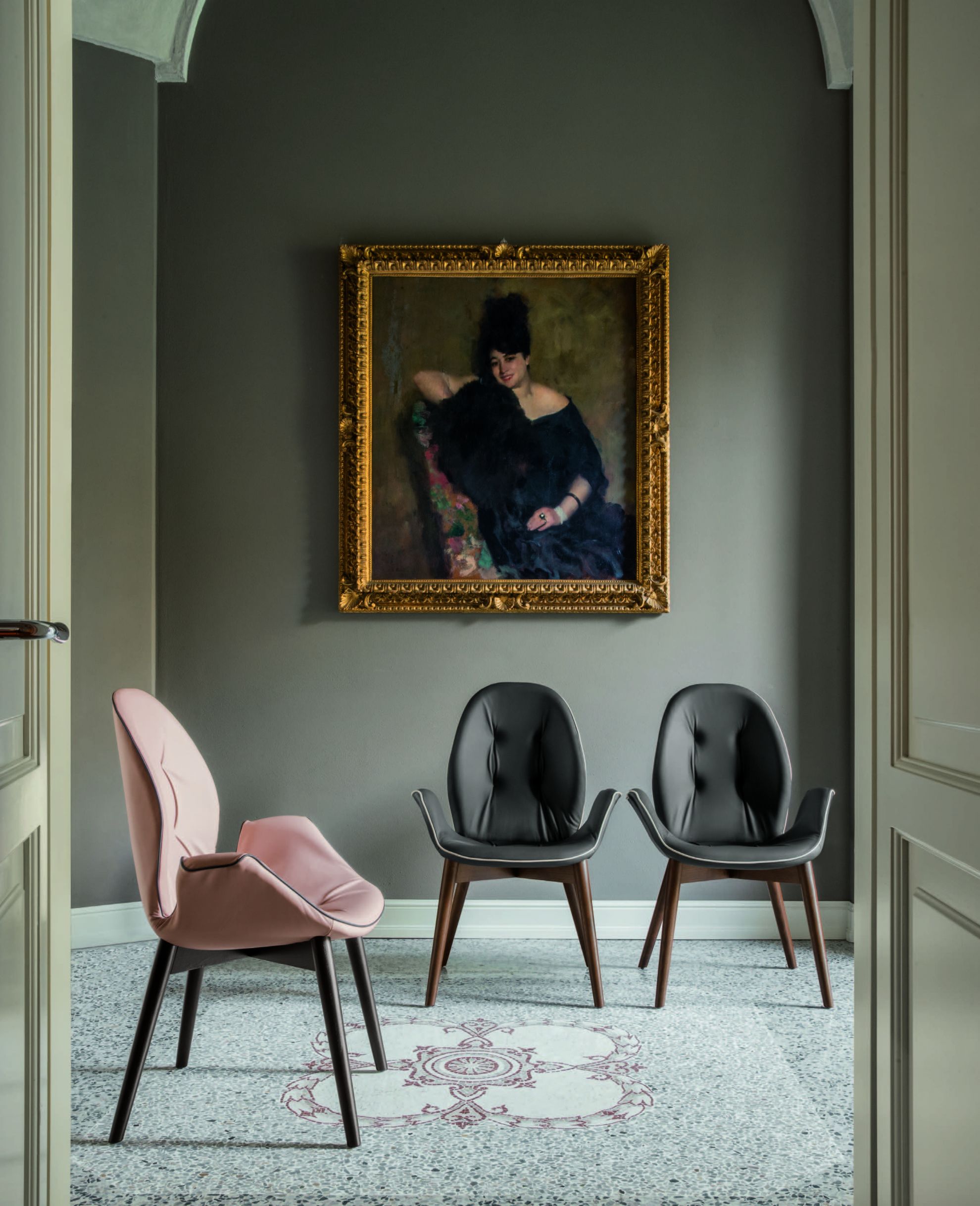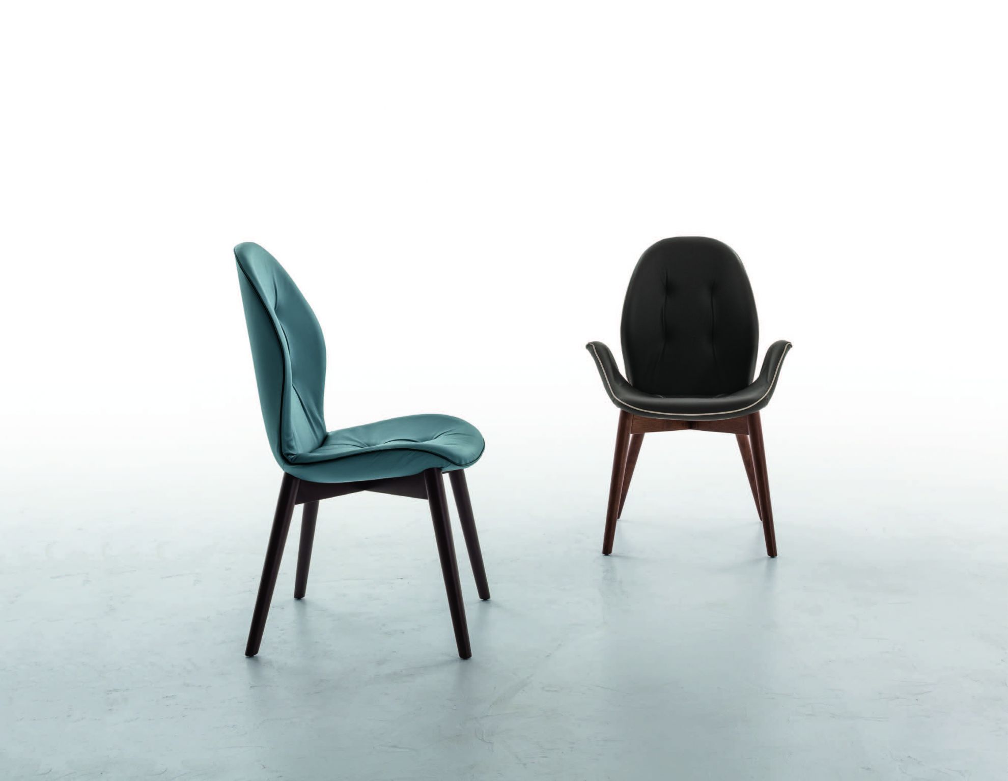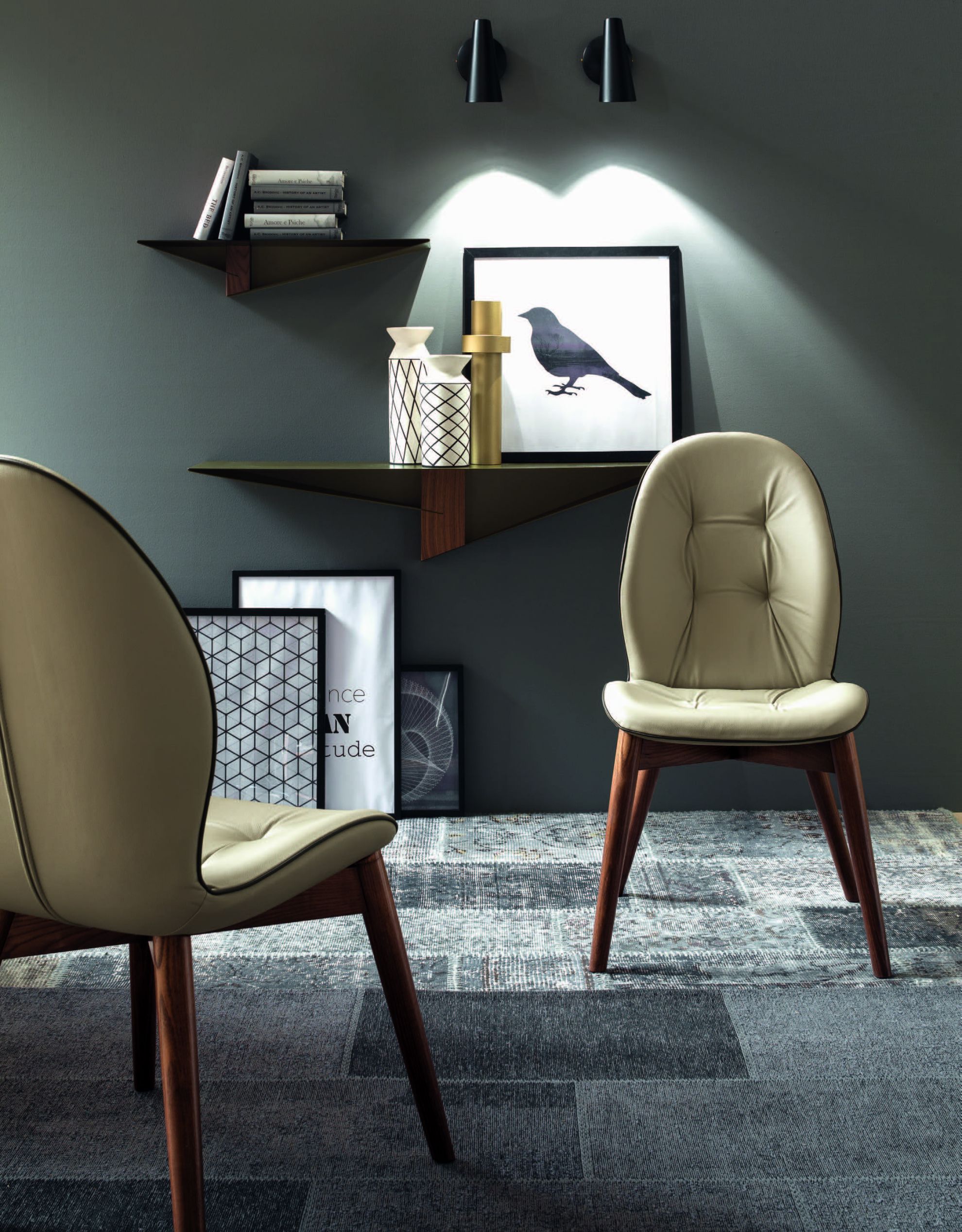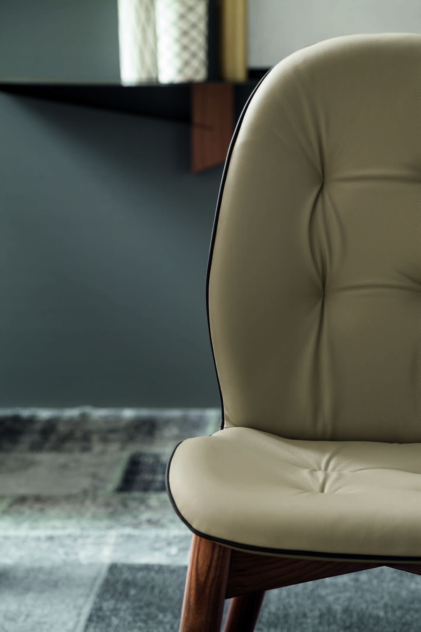Scaun SORRENTO de la Tonin Casa, cu structura din lemn de stajar sau nuc si husa din piele, disponibil in diverse culori si finisaje.