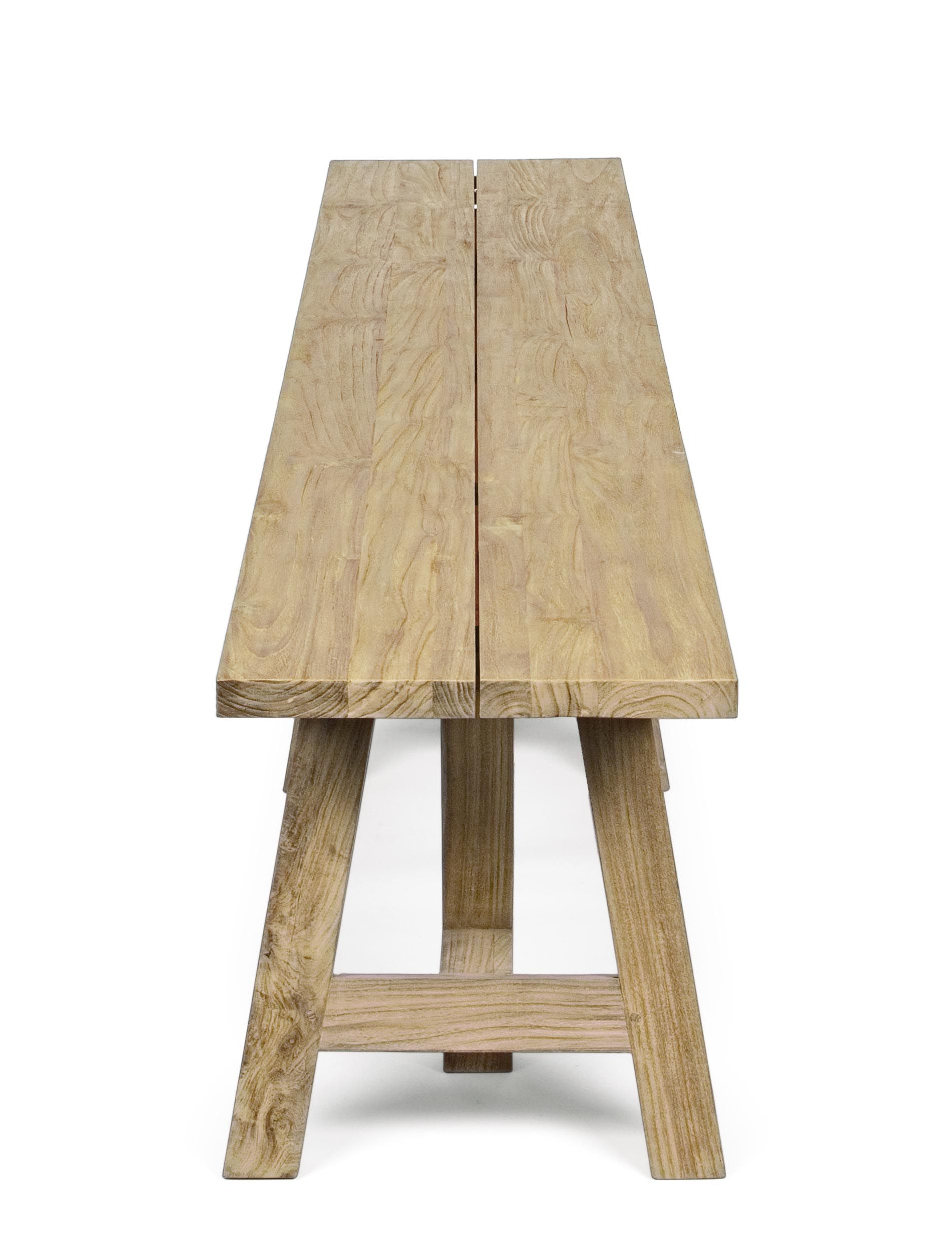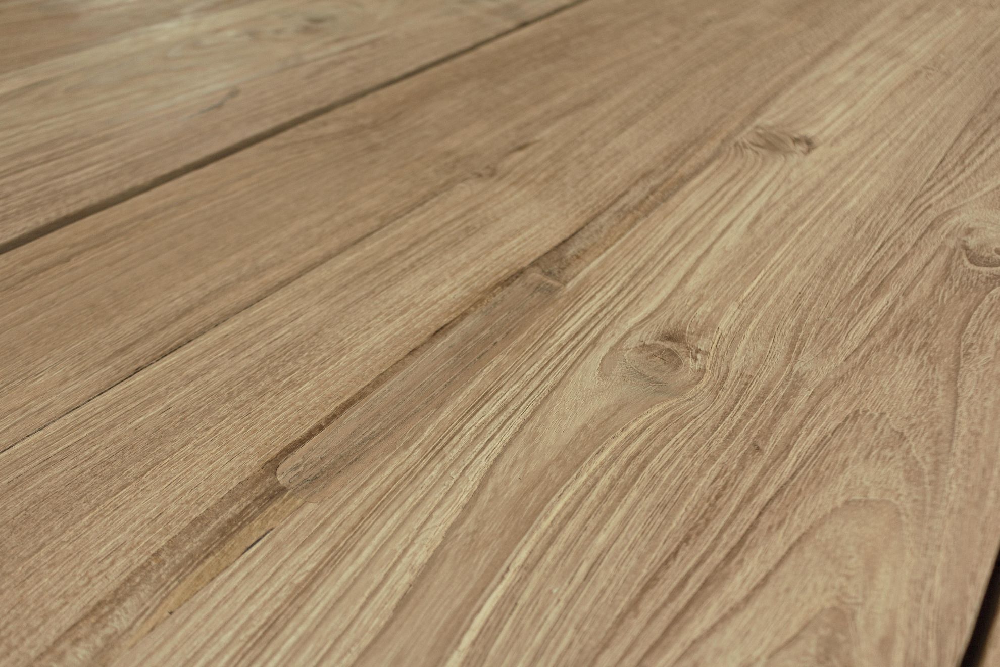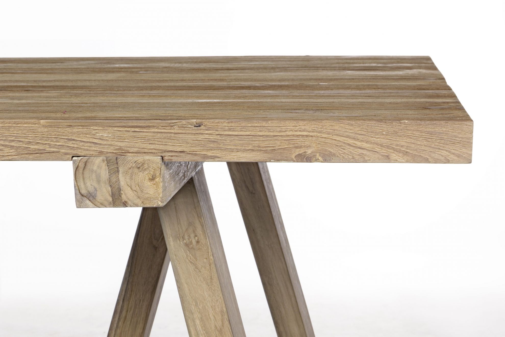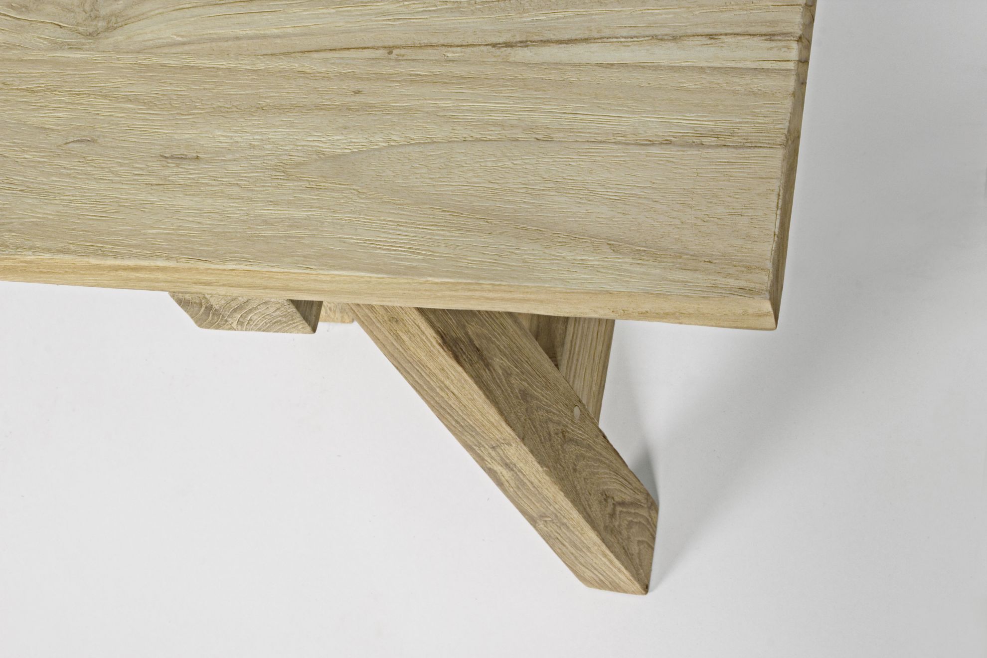 Set masa si doua banci pentru exterior din lemn de tec reciclat, finisaj rustic, picioare solide 9x4.5 cm.