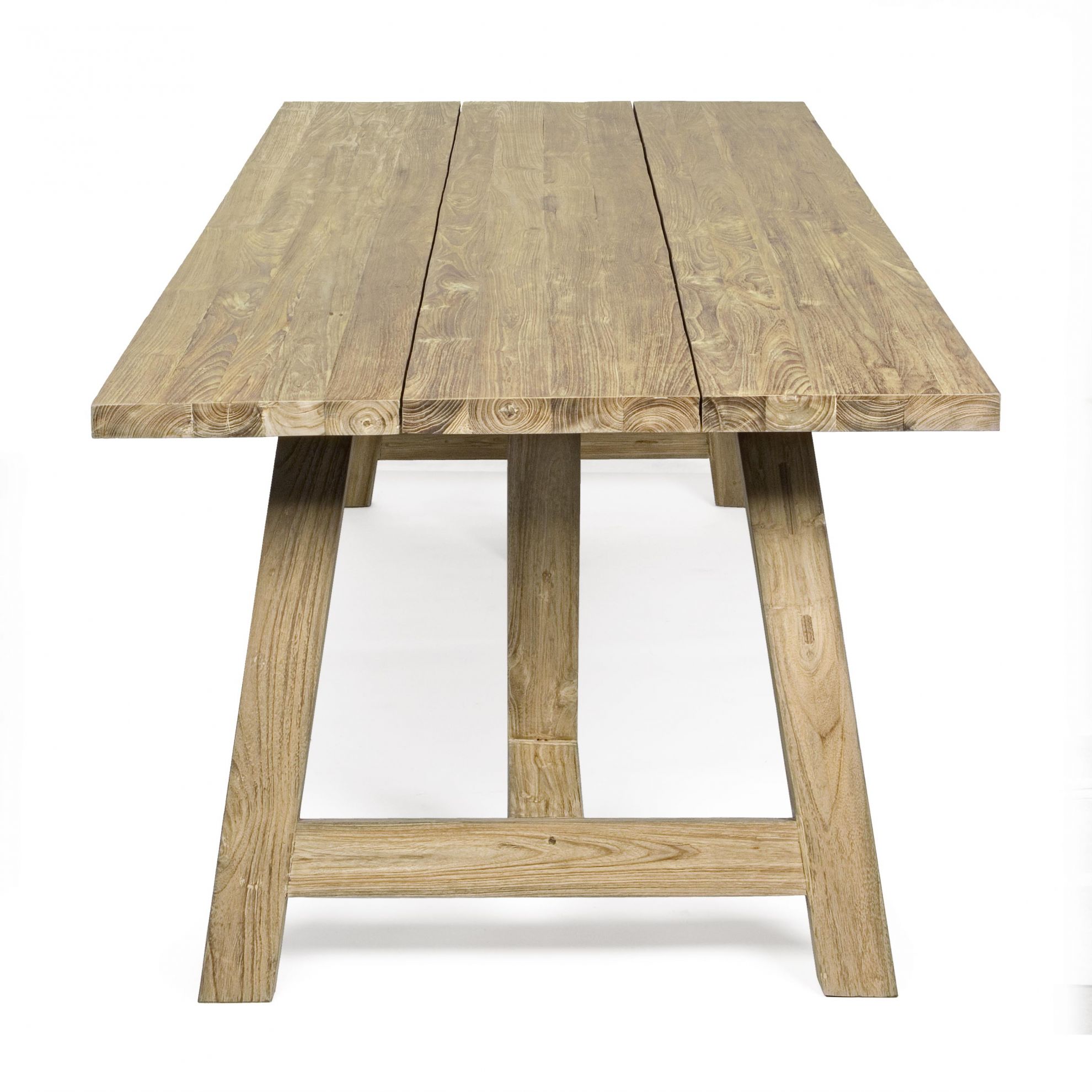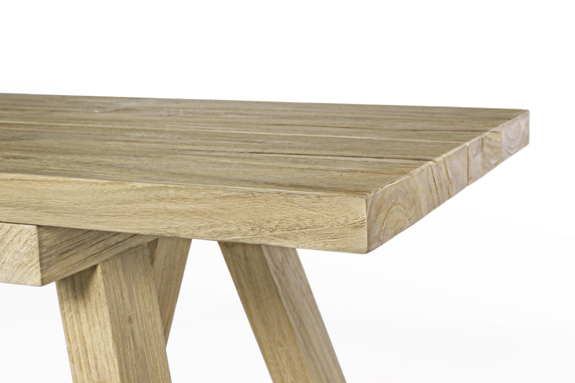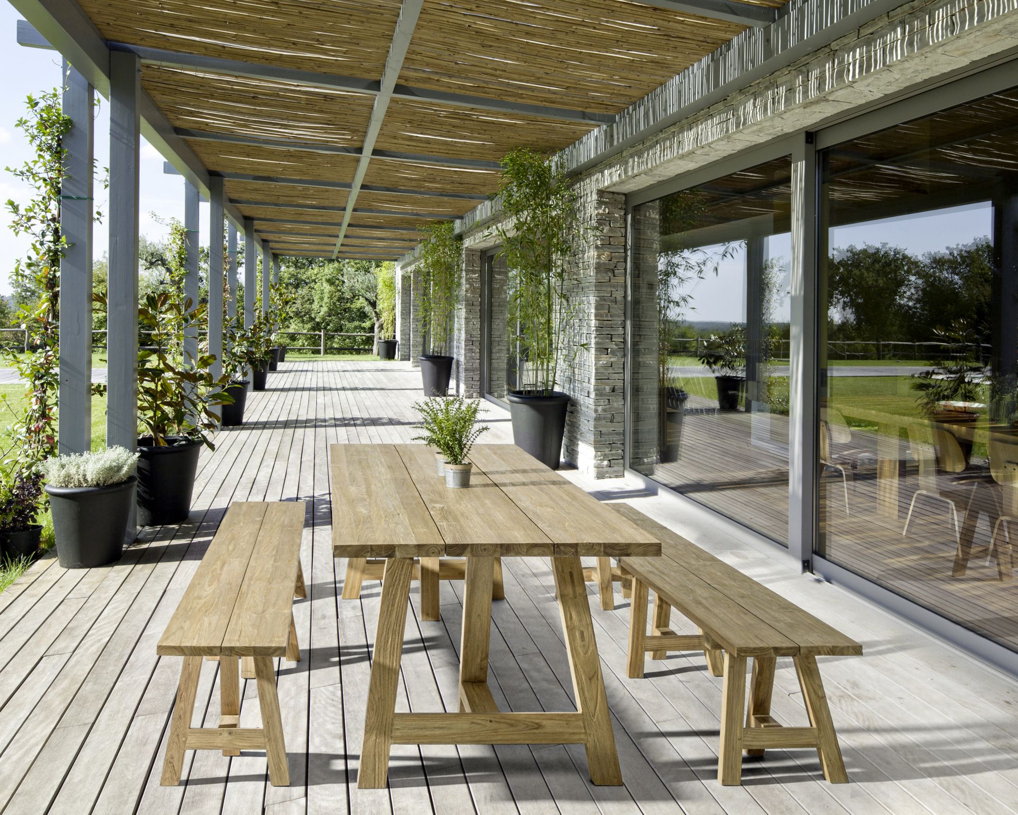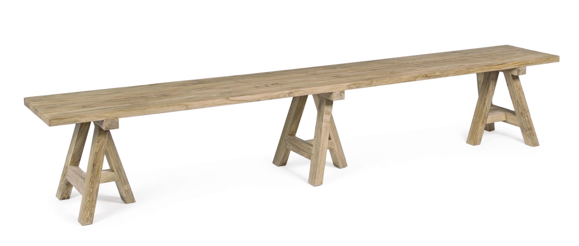 Set masa si doua banci pentru exterior din lemn de tec reciclat, finisaj rustic, picioare solide 9x4.5 cm.